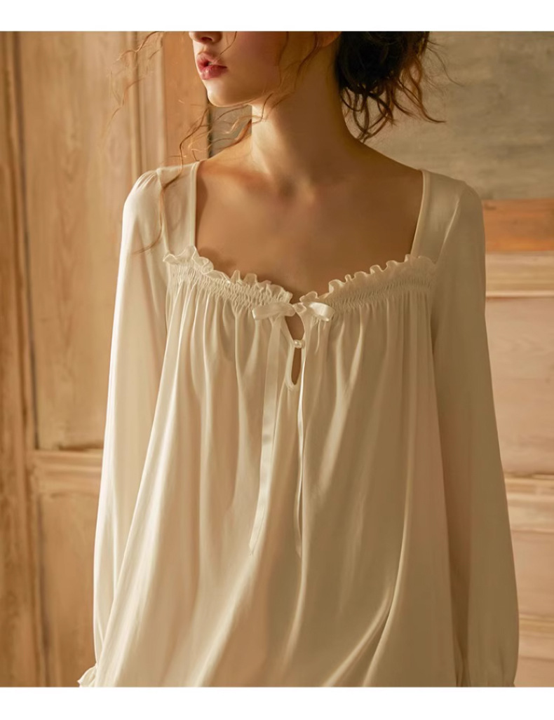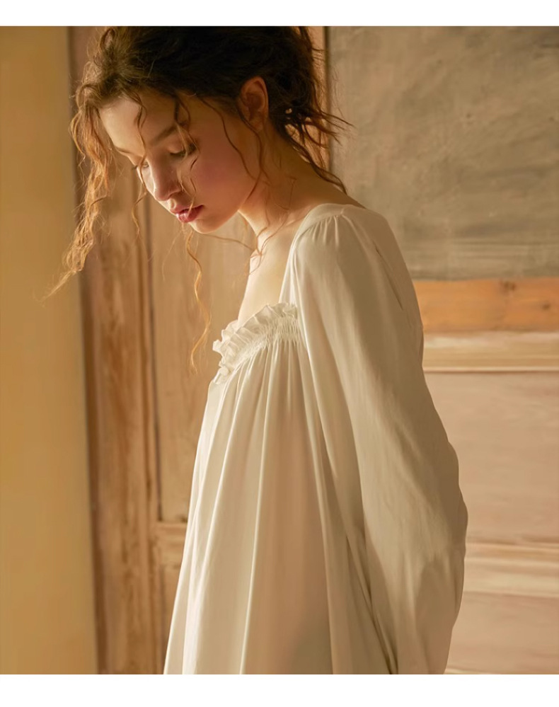 The square neckline enhances the neckline beautifully while maintaining a modest and refined look. Long sleeves add graceful structure, making it suitable for cooler evenings or transitional seasons. With its princess-inspired silhouette and relaxed fit, this cotton dress blends classic French charm with practical comfort.